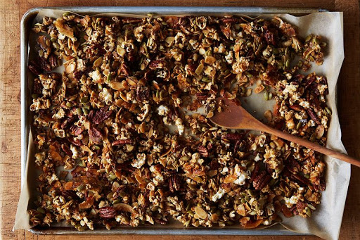 Remove granola from oven and season with more salt to taste. Let cool completely before serving or storing. You may get big chunks of brittle-like popcorn candy. Embrace it! I do not know how long this stores for exactly, as we ate it all in 2 days, but I imagine it will stay good for at least a week, though your popcorn may soften slightly.