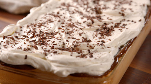 Make whipped cream: In a large bowl, combine the heavy cream with the sugar and vanilla extract and beat until stiff peaks form. Spread over cake and garnish with chocolate shavings.
