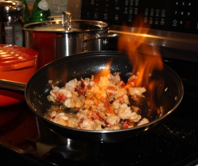 Warm the whiskey in a microwave for 10 seconds, tilt the pan and pour the whiskey into the bottom. Light carefully. Swirl the whiskey and flames all around the lobster until the flame extiguishes. Add the coral, stirring to break it up. Stir in the cooked the mushrooms.