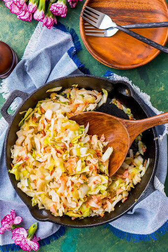 Irish Fried Cabbage and Bacon is a simple recipe that's pan fried in bacon grease and loaded up with bacon pieces and onion and seasoned with brown sugar, salt, and pepper.