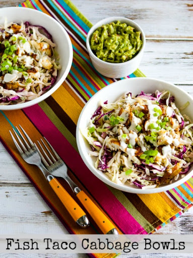 When the fish is done, let it cool slightly on a cutting board, then use two forks to shred the fish apart. Fill bowl with 1/4 of the cabbage mixture and top with desired amount of fish. Drizzle a little more dressing over the top. Serve right away, with guacamole if desired.