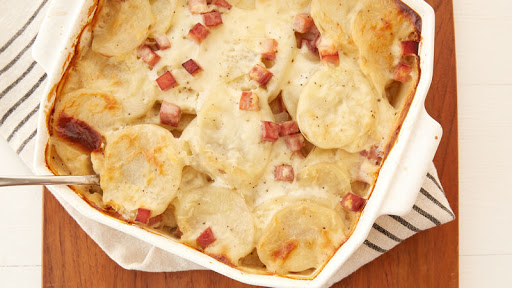 place cubed ham evenly throughought the baking dish over the potatoes and cheese. sprinkle half of the pepper jack over the ham.