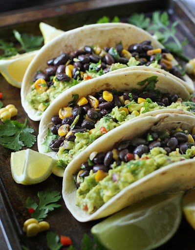 Veggie-loaded with lots of guacamole, black beans, corn, and peppers, these vegetarian tacos are full-on yummy.