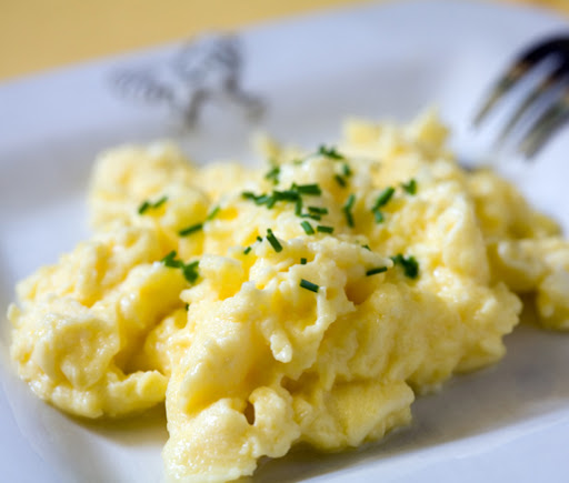 In a small bowl, lightly beat the eggs. Heat the butter in a small saucepan over medium heat until foamy. Add the eggs and cook, whisking, until they begin to set; gently whisk in the milk and chives. Remove from the heat and serve with toasted bread.
