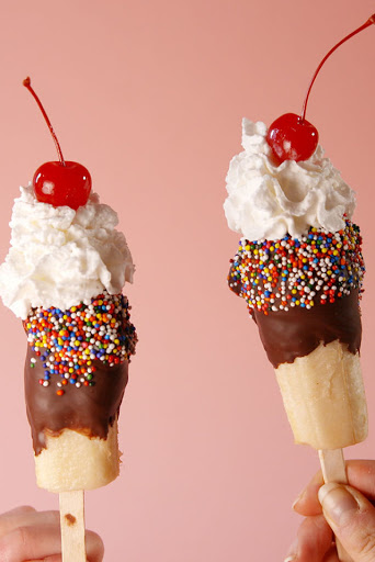 Top each pop with whipped cream and garnish with maraschino cherry.