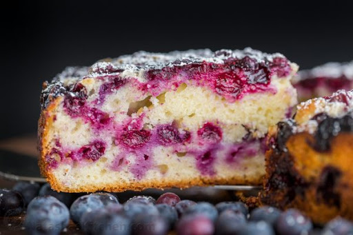 Pour half of batter into prepared springform pan and spread evenly. Top with half of the blueberries. Spread with remaining batter then sprinkle the rest of the blueberries evenly over the top, pushing them slightly into the batter (about halfway). Bake at 375˚F for 45 to 55 minutes (mine was perfect at 55 min), or until a toothpick inserted into center comes out clean. Let cake rest in the pan 15-20 minutes then remove ring and cool until room temp or just warm. Serve dusted with powdered sugar.