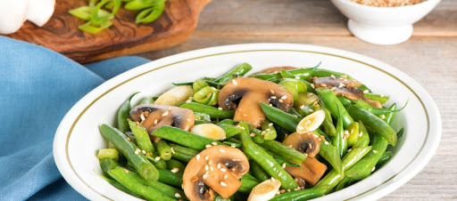 Combine tamari, sesame oil, nutmeg and sesame seeds in a large skillet and heat. Add green onions and mushrooms and cook until softened. Add green beans and toss to coat. You may substitute zucchini or broccoli for the green beans.