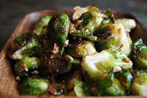 Brussel sprouts roasted in the oven until golden and crisp, and tossed with honey and pecans.