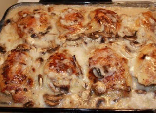 Prepare sauce with cream of mushroom and cream of chicken soup to a bowl. Whisk in the milk and half and half. (optional: 1/2 cup dry white wine) Salt and pepper to taste. Add the last 2 teaspoons of minced garlic and the remaining 2 teaspoons of thyme. Finally the sliced fresh mushrooms. Stir.
