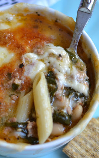 This soup is 'lick the bowl' good! Recipe features Italian sausage, onions, garlic, spinach and penne pasta topped with melted Swiss and Provel cheese. Enough said!