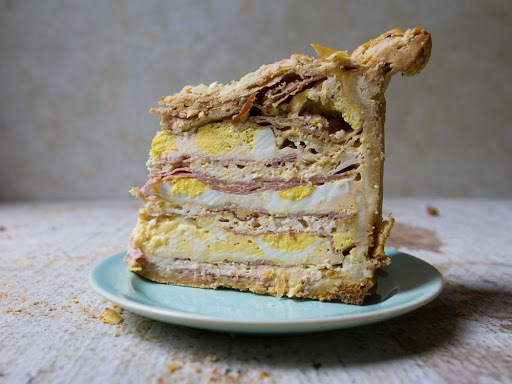 Heat oven to 425°. Beat 1 egg with 1 tbsp. water and set egg wash aside. On a lightly floured surface, roll larger dough disk into a 22" circle, about 1⁄8" thick; fit into an extra-deep (about 4") 9" spring-form pan, allowing about 1" to hang over the edge. Place a layer of salami completely covering the bottom of the pan, then a layer of basket cheese, a layer of prosciutto, a layer of mozzarella, and a layer of hard-boiled eggs, until you reach the top of the pan. Beat remaining eggs with remaining parmesan cheese, salt, and pepper and pour on top of ingredients. Roll remaining dough into a 13" circle and place on top of pie. Crimp edges, cut an X in the center and several more vents in top, and brush with egg wash. Bake 30 minutes, then reduce temperature to 325° and bake 2 1⁄2 hours more, or until the pastry is cooked and golden. Let cool before serving.