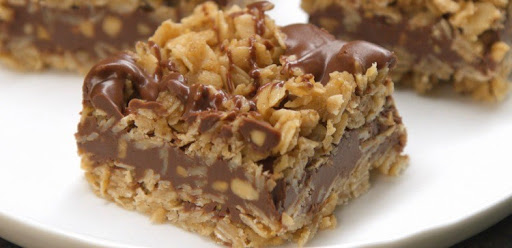 Pour ⅘ of the chocolate mixture into the pan over the pressed oats, reserving about ¼ cup for drizzling. Top with the remaining oats and drizzle with the remaining ¼ cup chocolate mixture.