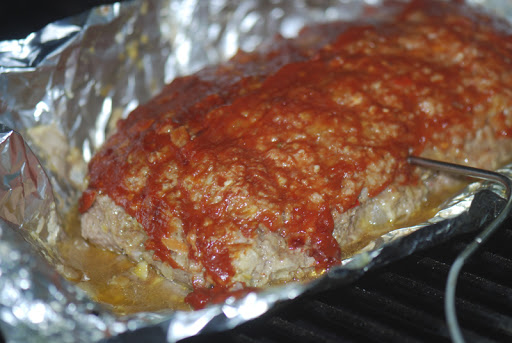 Flip over the meatloaf pouch and poke 12 to 15 holes in the aluminum foil package to allow the fat to drain off. Turn the pouch back over. Set the meatloaf in the smoker and place a drip pan on the rack immediately below the meatloaf. Cook for 45 minutes.