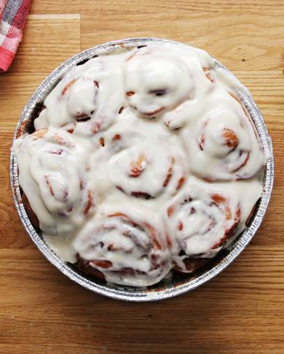 18. Remove the cinnamon buns from the oven. While still warm, drizzle evenly with frosting.