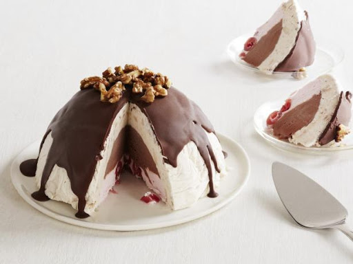 Remove the bombe from the freezer; invert onto a plate and remove the bowl and plastic wrap. (If it sticks, run a small spatula around the edge to loosen.) Return to the freezer.