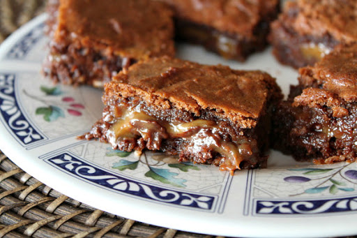 Pour a little over 1/2 of the batter into the prepared pan. Bake for 8 minutes only and then remove from the oven. Sprinkle chocolate chips evenly on top of the partially cooked brownie. Drizzle caramel on top of the chocolate chips. Drop spoonfuls of the remaining batter on top. You probably won't have enough to cover the caramel completely.