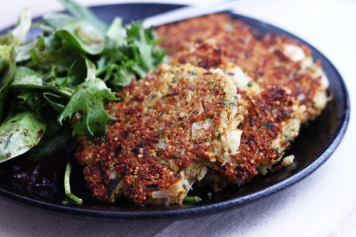 Heat the olive oil (enough to coat the bottom of the pan – the exact amount will depend on the size of the pan you use) in a skillet or wide frying pan over medium. Pat the mixture into patties and cook in batches, about 10 minutes on each side, flattening so they’re about 1/2″ thick. Flip carefully! They should be browned on one side after 10 minutes – if not, adjust the heat.