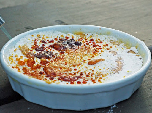 Preheat the oven to 350 degrees. Pour the cream into a pan and stir in the vanilla beans and bring to a simmer. Remove from heat, cover the pan, and let steep for 30 minutes. Whisk the egg yolks and sugar in the mixing bowl until the yolks are thick, pale yellow, and form a fat, slowly dissolving ribbon when dropped from the whisk back into the bowl. Remove the vanilla bean from the hot cream. Temper the yolks, by slowly stirring the warm milk into the yolks, until all the cream has been added and the mixture is well mixed. Skim off any bubbles from the surface of the custard. Arrange ramekins in a baking pan and ladle the custard into each, leaving 1/4 inch at the top for the glaze. Set the baking pan in the oven and pour in enough hot water to come halfway up the ramekins. Bake the custards for 30 – 35 minutes, until the tops are set but the custard in the center is still soft to the touch. Carefully remove the baking pan from the oven, and lift the ramekins from the hot water. Let them cool briefly, and then chill thoroughly in the refrigerator, over night. Sprinkle a tablespoon or so of the powdered sugar over each custard and smooth it gently with the back of a spoon, forming an even layer of sugar that completely covers the surface. Using a cooking torch, melt the sugar until it starts to caramelize. Serve. Eat.