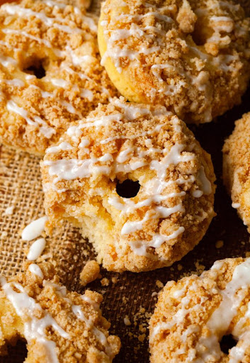 Spoon batter into a medium-sized Ziploc bag and seal. Cut off one corner of the bag and fill each doughnut cup ¾ full. Divide crumb topping equally between the 6 donuts. Place into the preheated oven and bake for 14-16 minutes or until donuts are slightly golden. Remove from oven and let rest in the doughnut pan for 5 minutes or until slightly cooled. Remove donuts and place on a wire rack.
