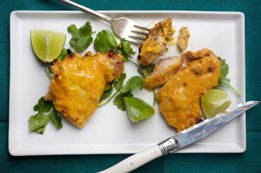 Place the chicken on a broiler pan, allowing some marinade to cling. Broil for about 8 minutes, then use tongs to turn the chicken over and spoon a bit more marinade on the second side. (Discard any remaining marinade, at this point.) Broil for about 9 minutes, until lightly charred around the edges and the chicken is cooked through.