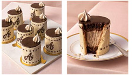 Pipe a layer of ganache (about 1 tablespoon) onto Bavarian cream, and then top with a chocolate jocande round, syrup side down. Refrigerate until cream is firm, at least 4 hours (or up to 12 hours).