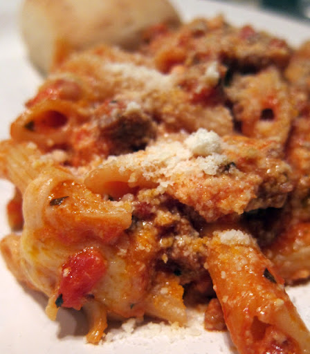 Combine sauce, water, ricotta 1 cup of mozzarella, sausage, parmesan and penne. Pour into 9x13 pan and cover with foil. Bake for 55 minutes. Remove foil and top with remaining mozzarella cheese. Bake for 5 to 10 minutes, until bubbly.