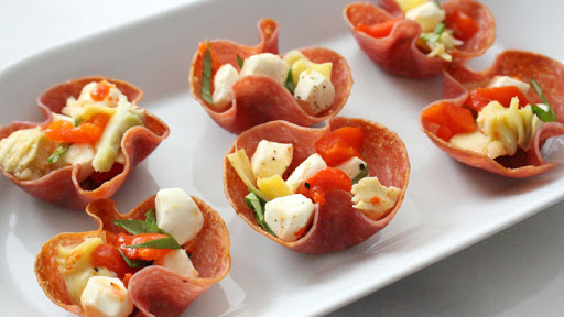 Bite size antipasto fills cups made from sliced salami. Mix up the antipasto filling with your favorite veggies and cheese. These will impress your guests.