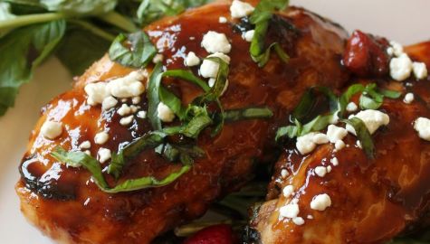 Meanwhile, whisk together strawberry jam, balsamic vinegar and water in a small bowl. When chicken is just about finished cooking, pour mixture over the top, nestling the chicken breasts into the sauce and scraping up brown bits on the bottom of the pan.