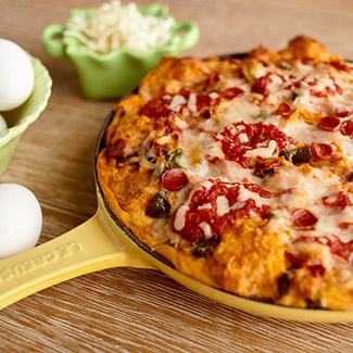 In a large mixing bowl, combine the eggs, heavy cream, milk, oregano, salt, pepper, Parmesan, half of the pizza sauce, and sautéed vegetables. Fold in the pepperoni, cubed bread, and 1 cup mozzarella. Let the mixture sit for 5 minutes.