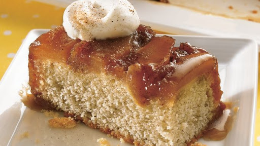 Run knife around sides of pan to loosen cake. Place heatproof serving plate upside down over pan; turn plate and pan over. Remove pan. Serve warm cake with whipped cream. Store cake loosely covered.