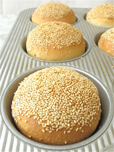 5) Place the rolls into the cups of a lightly greased hamburger roll pan, or onto a lightly greased or parchment-lined baking sheet. Press gently to flatten.