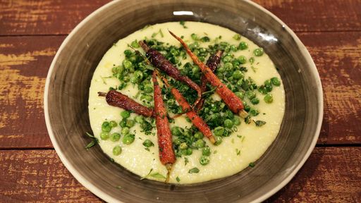 To Assemble: Spoon the polenta onto a long platter and top with peas, then roasted carrots. Garnish with mixed herbs.