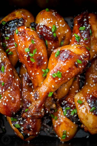 While chicken is baking, pour reserved ⅔ cup marinade into a small saucepan. Bring to a boil then reduce heat and simmer 7 minutes or until thickened and syrupy. Remove from heat and brush over baked chicken drumsticks. Garnish with sesame seeds and chives.