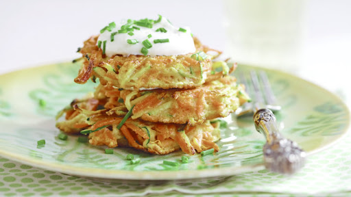 Heat a thin layer of olive oil in a sauté pan over medium heat. It’s important that the heat not be too hot or too cool, because you want the pancakes to cook all the way through the middle by the time they’re brown on the outside. When the oil is hot, drop pancake-size dollops of the veggie mixture into the pan, without overcrowding. Cook for 3 to 4 minutes, or until the bottom starts to brown. Flip and cook until browned on both sides, then repeat until the batter is gone.