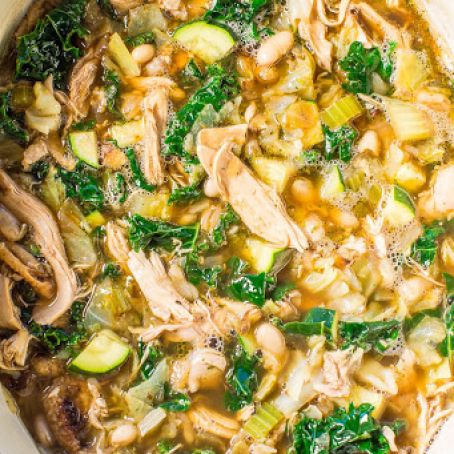 A healthy and hearty chicken soup with kale, beans, onions, cabbage and zucchini. Soup will keep airtight in the fridge for 5 to 7 days or in the freezer for up to 6 months.