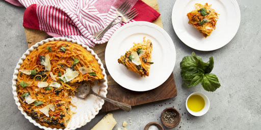 Make the quiche: In a medium bowl, whisk together eggs, cream, milk, butter, basil, salt and pepper. Pour mixture over spaghetti.