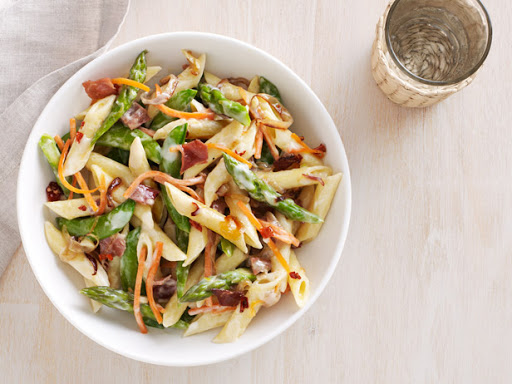 Bring a pot of water to a boil, salt it generously and cook the pasta for 8 minutes; add the asparagus, carrot and snap peas and cook for 3 minutes. Check the pasta and vegetables to make sure they're cooked through but still have texture, then drain.