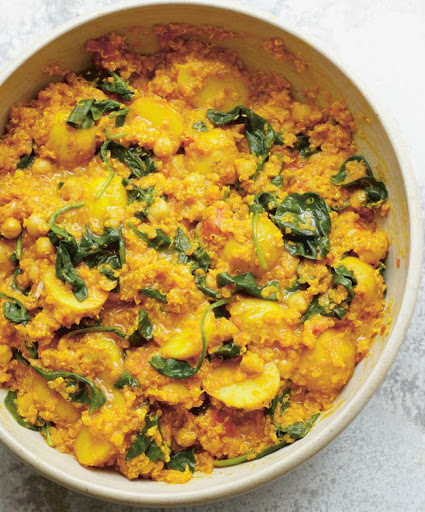 Place the potatoes in a large pan and add the garlic, turmeric, coriander, chilli, ginger, coconut milk, tomato purée and tomatoes. Bring to the boil, season with salt and pepper, then add the quinoa with a mug of just-boiled water (300ml).