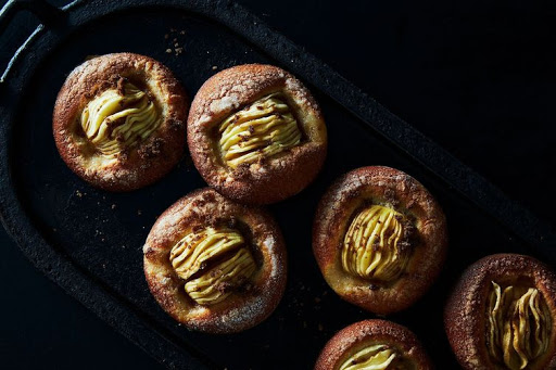 Make the dough the day before you want to make the Danish. In the bowl of an electric mixer fitted with the hook attachment, mix the bread flour, sugar, cinnamon, ginger, nutmeg, yeast, and salt to combine, 15-20 seconds. In a container with a spout (like a 2 cup liquid measuring cup), whisk the eggs, milk, and vanilla to combine. Add this mixture to the mixer and mix on low speed for 3 minutes, or until the dough comes together. (It will be relatively sticky.) Raise the speed to medium and mix for 5 minutes more. During this time, gradually add the butter (about 1 tablespoon at a time, though no need to be precise—I just grab soft butter with my hands and throw it in willy-nilly). Once the butter is fully incorporated, transfer the dough to a large greased bowl. Cover the bowl with plastic wrap, and let rise at room temperature for 1 hour. Refrigerate the dough for 10-12 hours (overnight). The next day, roll the dough out on a lightly floured surface to about 1/2-inch of thickness. Cut rounds from the dough using a 3-inch round cookie cutter (or the rim of a large glass). You can re-roll the dough a couple times—just remember it will get tougher the more you work it. Transfer the rounds to parchment lined baking sheets, leaving about 1 inch between each piece. Cover the dough circles with greased plastic wrap and let rise for 45 minutes to an hour. While the dough rises, prepare the topping. Cut the apples into quarters, then cut away the core at an angle, leaving a flat surface on the base of the apple quarter. Thinly slice each piece of apple, but not fully, like for hasselback potatoes. Cut the apple 3/4 way through, allowing the pieces to separate at the top but stay together at the base. Just before the brioche pieces are done rising, preheat the oven to 375 degrees F. Egg wash the surface of each brioche evenly. Sprinkle granulated sugar evenly over the surface of each piece of dough. Place a prepared sliced apple quarter in the center of each brioche. Sprinkle dark brown sugar evenly over the surface of each apple. Place a small pat of butter (about 1/2 teaspoon) on top of each apple. Transfer the brioche to the oven and bake until the apples are tender and the brioche is golden, 17-22 minutes. Cool at least 10 minutes before serving. They are absolutely the best served warm.