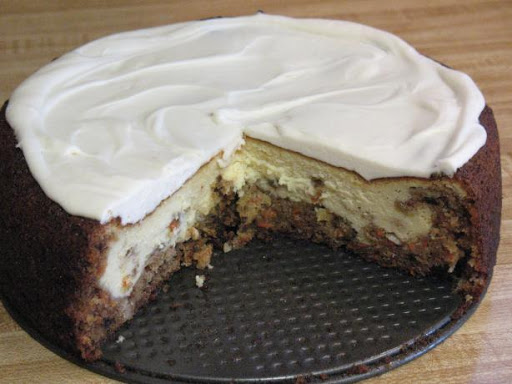 1 To make cheesecake, 2 In large bowl of electric mixer, beat together 2 pkgs cream cheese and 3/4 cup sugar until smooth. 3 Beat in 1 tablespoon flour, 3 eggs and 2 teaspoons vanilla until smooth. Set aside. 4 Meanwhile prepare Carrot Cake: In large bowl, combine oil, 1 cup sugar, 2 eggs and 1 teaspoon vanilla, blending thoroughly. 5 Stir in 1 cup flour, baking soda, cinnamon and dash salt, mixing well. 6 Stir in drained pineapple, carrots, coconut and walnuts. 7 Spread 1 1/2 cups carrot cake batter over bottom of greased 9-or 9 1/2-inch springform pan. 8 Drop large spoonfuls of cream cheese batter over carrot cake batter; top with large spoonfuls of remaining carrot cake batter. 9 Repeat with remaining cream cheese batter, spreading evenly with a knife. 10 Do not marble with a knife. 11 Bake in preheated 350 degree oven for 1 hour, shut oven off and leave cake in oven for 45 minutes. 12 Cool to room temperature, then refrigerate. 13 When cake is cold, prepare Pineapple Cream Cheese Frosting. 14 In a bowl of electric mixer, combine 2 oz cream cheese, butter, powdered sugar, 1/2 teaspoon vanilla, 1 tablespoon reserved pineapple juice and dash of salt. 15 Beat until smooth and of spreading consistency. 16 Frost top of cheesecake. 17 Refrigerate 3 to 4 hours before serving.