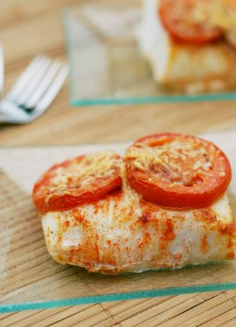 1 Combine all spices in a small bowl and set aside. 2 Preheat oven to 425°. Cut fish into 4 (two per serving), and place fillets in a 9 x 13-inch baking pan. 3 Melt butter in a small bowl in the microwave for 10-20 seconds. Brush the top of each fillet with butter, squeeze little lemon juice on the fish, then sprinkle the spice blend evenly over the top of each fillet. 4 Arrange 2 to 3 tomato slices over top of each fillet. 5 Sprinkle grated parmesan cheese over each tomato slice. Each slice should be about half covered. 6 Bake the fish, uncovered, for 8 minutes, then turn oven to a high broil and continue to cook for 6 to 8 minutes, or until cheese on tomatoes begins to brown. 7 Serve two pieces of fish per serving with rice on the side.