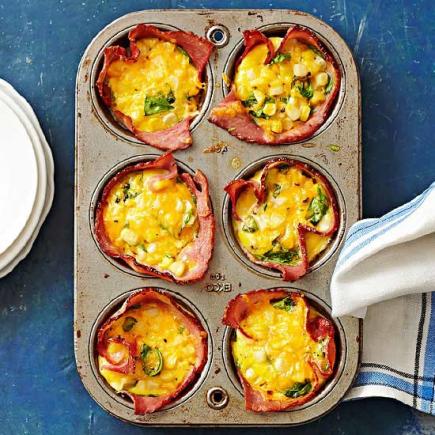 Coat six 2 1/2-inch muffin cups with cooking spray. Line each muffin cup with a ham slice. Divide spinach, cheese and corn among cups.