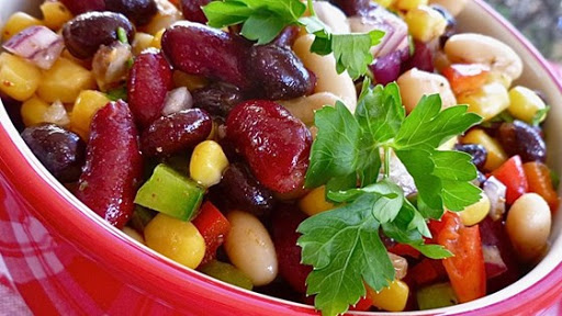 n a large bowl, combine beans, bell peppers, frozen corn, and red onion.