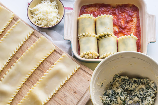 Spread a spoonful of pasta sauce in the bottom of a casserole pan. Assemble the rolls by spreading a spoonful of cheese mixture, leaving an inch at the end. Roll up pasta, ending with the uncovered edge.