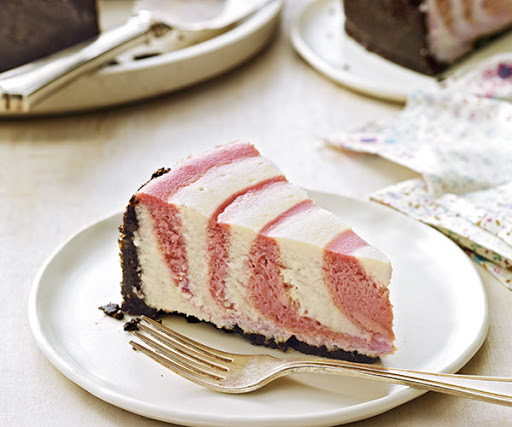 This decadent raspberry–vanilla zebra cheesecake is a showstopping, sophisticated version of one of America’s favorite desserts, and it’s deceivingly easy to prepare. Both the crisp, nutty crust and smooth, airy mascarpone–cream cheese filling mix up quickly before assembling and baking. Plus, this cake can be made several days in advance, making it a perfect party dessert.