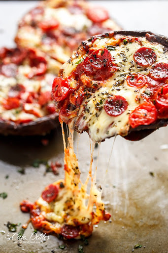 Fill each mushroom with 2 tablespoons of the pizza sauce per cap, ¼ cup of mozzarella cheese, 6 pepperoni miniatures and tomato slices. Broil / grill until cheese has melted and is golden in colour (about 8 minutes).