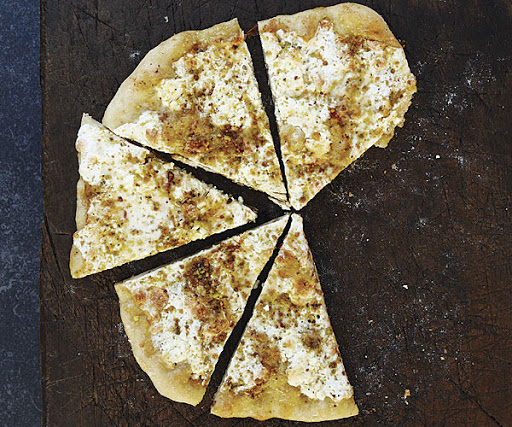 Pistachio may sound like an unusual pizza topping, but trust us—its toasty flavor goes incredibly well with cheese. This recipe makes more pesto than you need for two pizzas, but you can freeze it in small batches for future good eating.