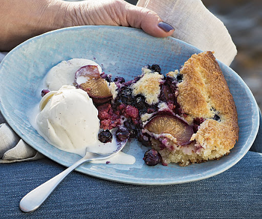 This essence-of-summer cobbler is perfect for making on vacation: It couldn't be easier to make, it can be made with whatever fruit looks good, and it's even an easy recipe to commit to memory. Plus, you can bake it in whatever dish or pan you have, from a 3-quart casserole to a large skillet.