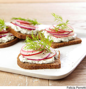 In this radish tea sandwich recipe with a creamy dill spread, the delicate tea sandwiches are served open-face to show off the pretty sliced radishes on top.