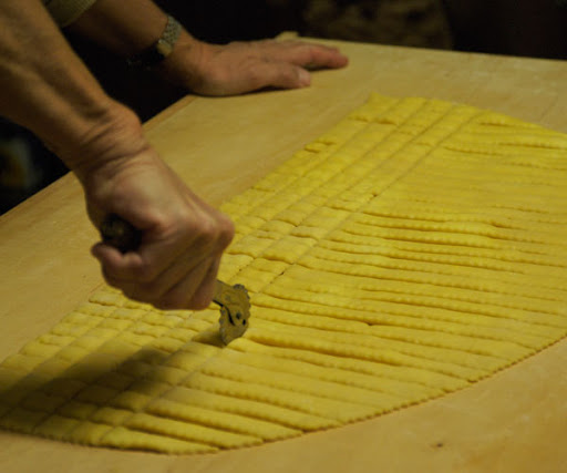 On a clean work surface lightly dusted with flour, roll out the pasta dough into an 18-inch circle 1/8 inch thick. Spread a thin layer of the cheese filling over the bottom half of the dough. Fold the top half of the dough over the filling to form a half moon. With a handheld pasta cutter, cut the dough into long vertical strips 1/2 inch wide. Then cut horizontally every 1/4 inch to make small rectangles.